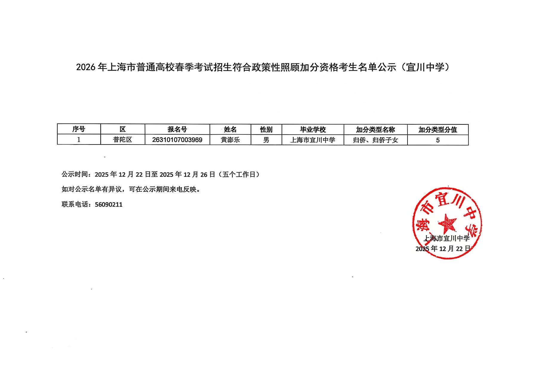 2026年上海市普通高校春季考试招生符合政策性照顾加分资格考生名单公示(宜川中学)